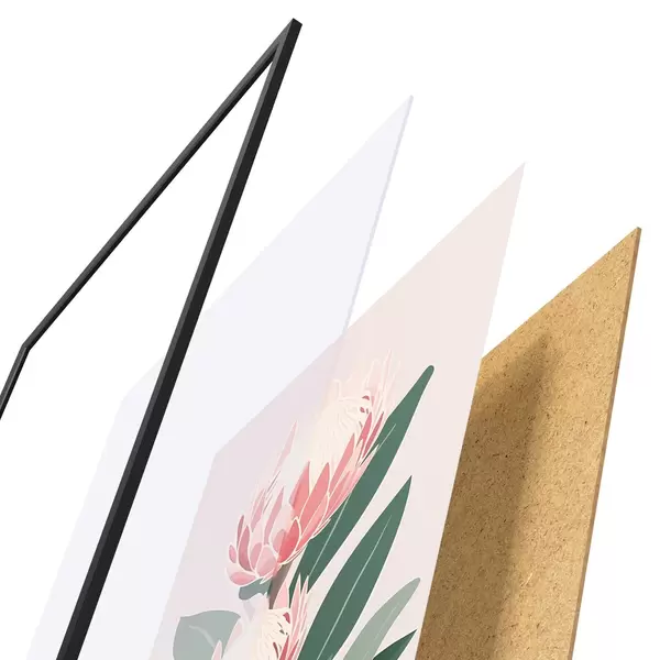 De poster bestaat uit een frame, plexiglas, geprinte afbeelding en spaanplaat achterkant. De poster kan meteen aan de muur worden gehangen dankzij de bevestigingen op de achterkant.