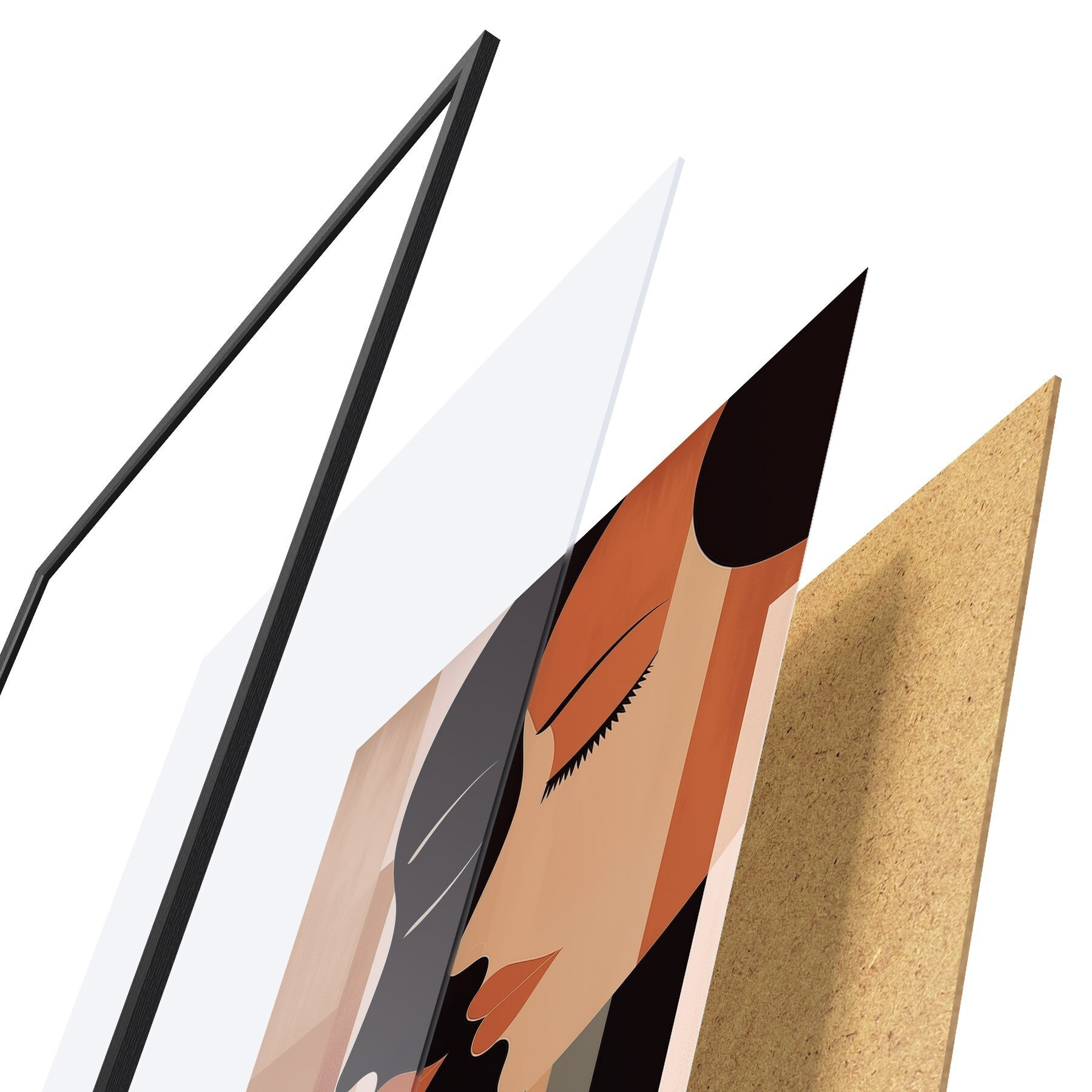 De poster bestaat uit een frame, plexiglas, geprinte afbeelding en spaanplaat achterkant. De poster kan meteen aan de muur worden gehangen dankzij de bevestigingen op de achterkant.