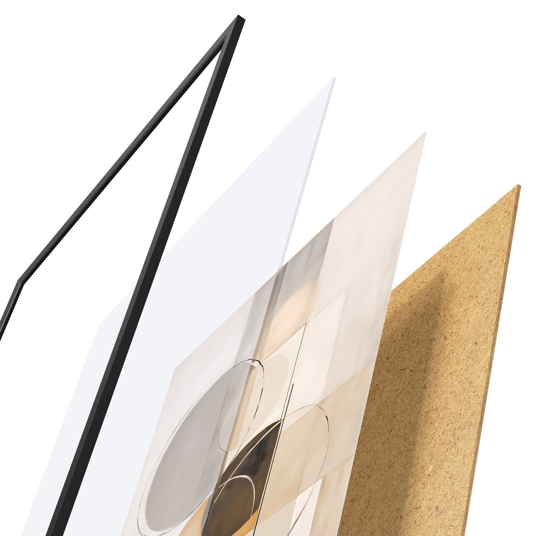 De poster bestaat uit een frame, plexiglas, geprinte afbeelding en spaanplaat achterkant. De poster kan meteen aan de muur worden gehangen dankzij de bevestigingen op de achterkant.