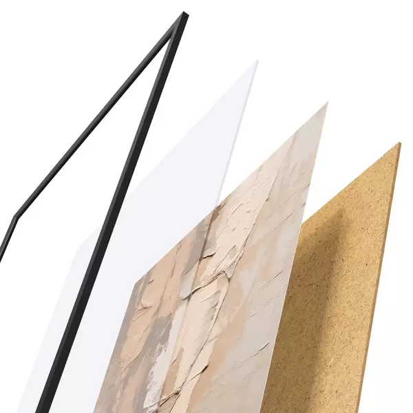 De poster bestaat uit een frame, plexiglas, geprinte afbeelding en spaanplaat achterkant. De poster kan meteen aan de muur worden gehangen dankzij de bevestigingen op de achterkant.
