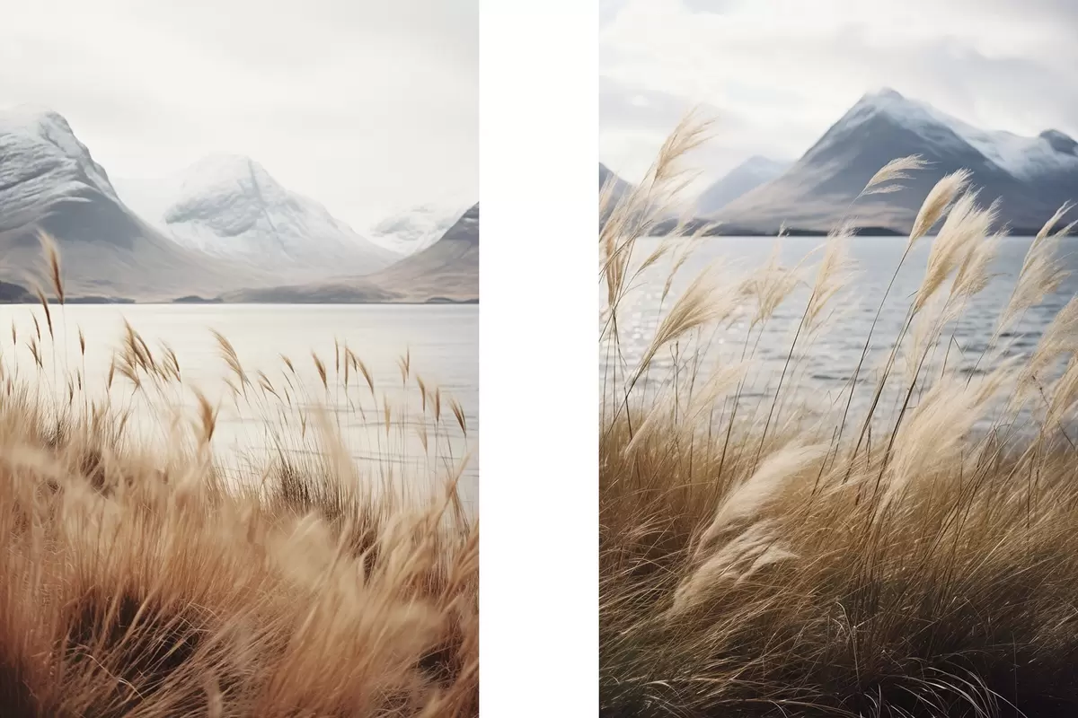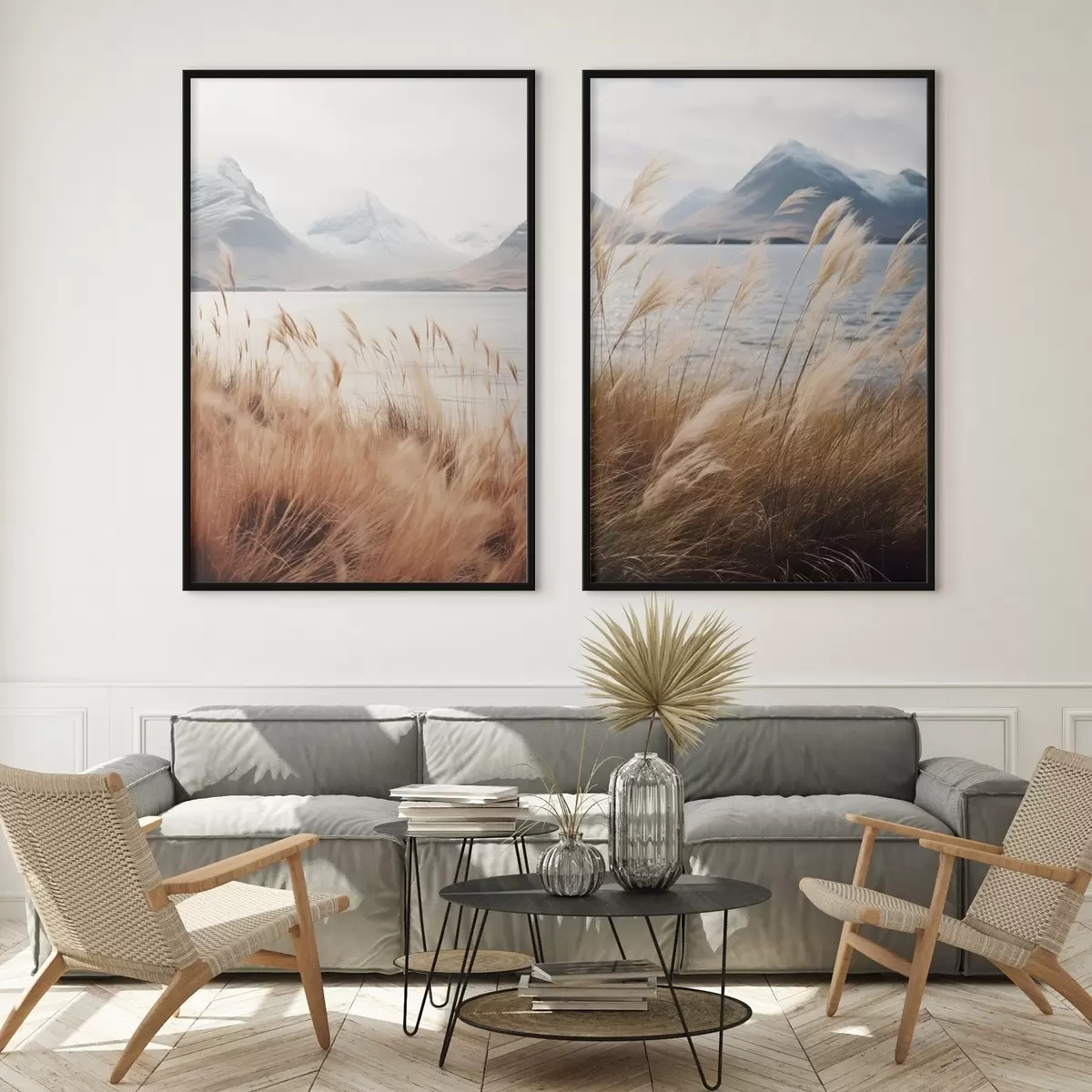 Poster Pampagras met een meer en bergen op de achtergrond, zachte belichting, gedempte kleuren, naturalistische stijl N° d00884