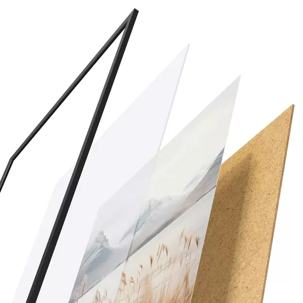 De poster bestaat uit een frame, plexiglas, geprinte afbeelding en spaanplaat achterkant. De poster kan meteen aan de muur worden gehangen dankzij de bevestigingen op de achterkant.