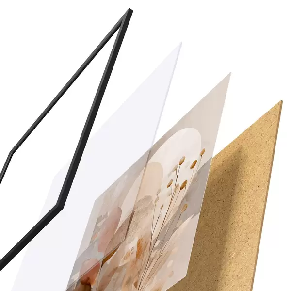 De poster bestaat uit een frame, plexiglas, geprinte afbeelding en spaanplaat achterkant. De poster kan meteen aan de muur worden gehangen dankzij de bevestigingen op de achterkant.