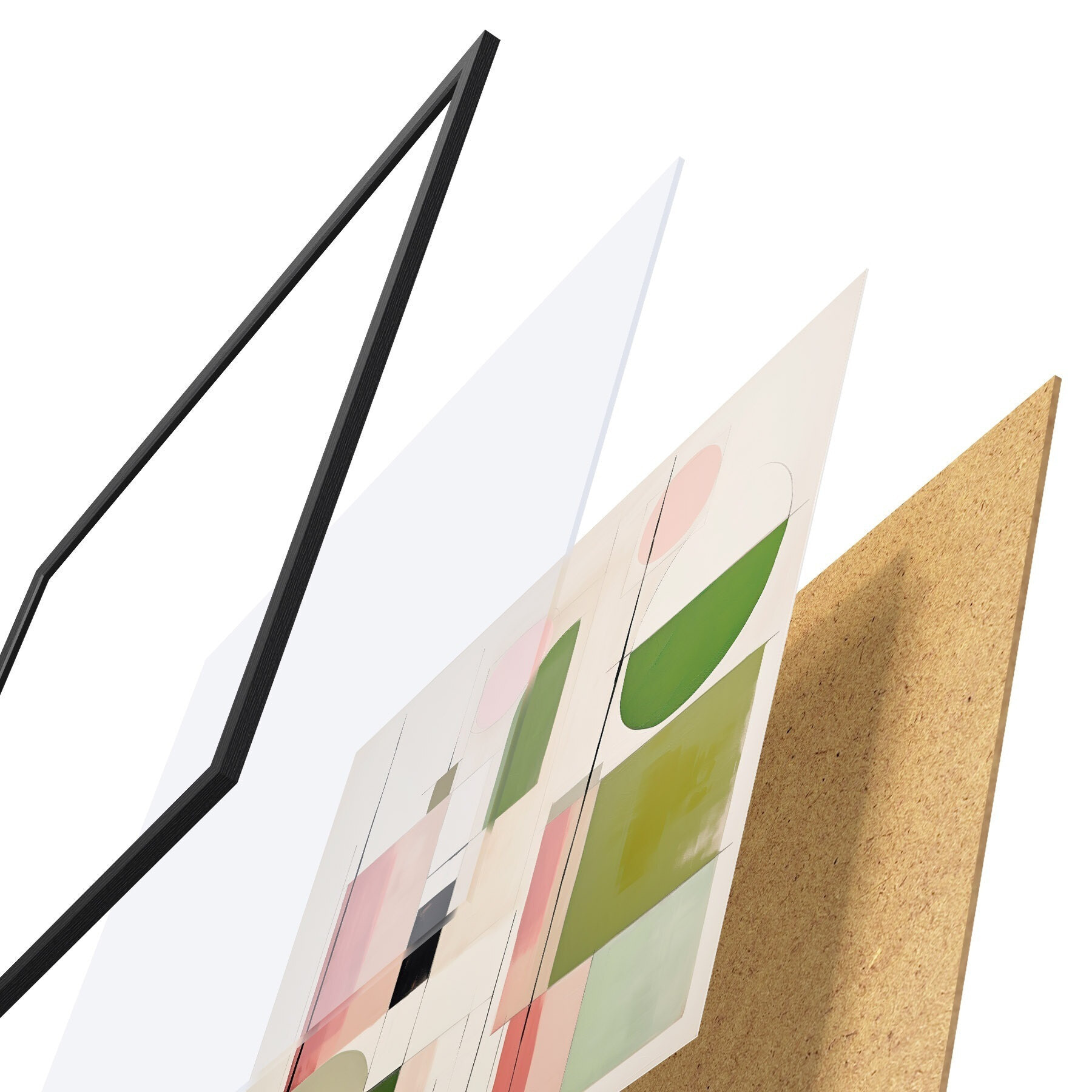De poster bestaat uit een frame, plexiglas, geprinte afbeelding en spaanplaat achterkant. De poster kan meteen aan de muur worden gehangen dankzij de bevestigingen op de achterkant.