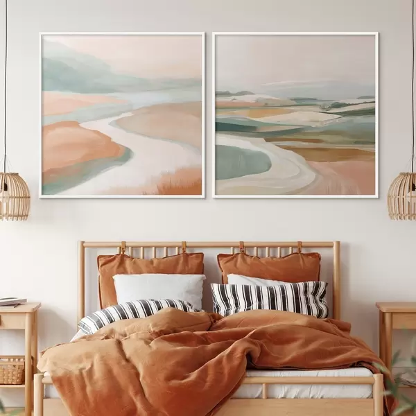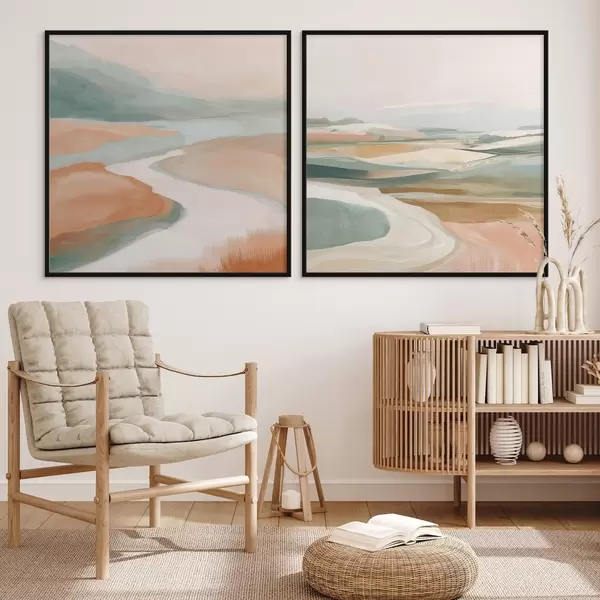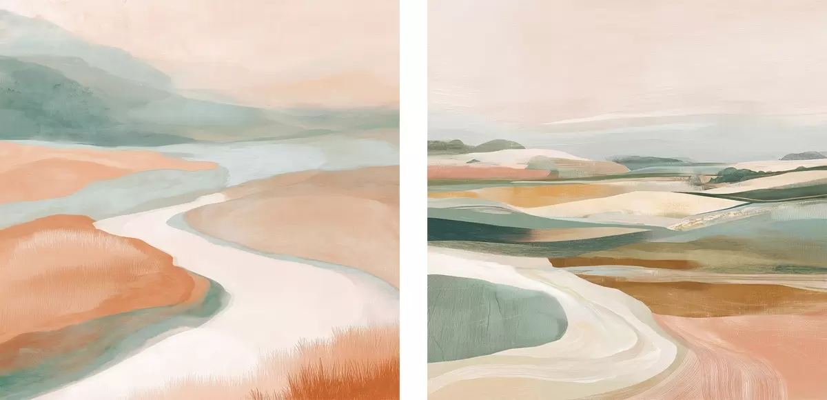 Poster Abstracte heuvels en rivier in pastelkleuren N° d00896