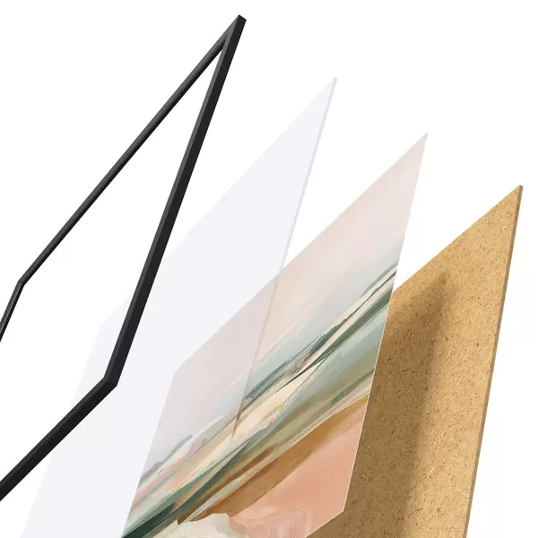 De poster bestaat uit een frame, plexiglas, geprinte afbeelding en spaanplaat achterkant. De poster kan meteen aan de muur worden gehangen dankzij de bevestigingen op de achterkant.
