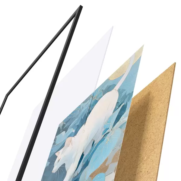 De poster bestaat uit een frame, plexiglas, geprinte afbeelding en spaanplaat achterkant. De poster kan meteen aan de muur worden gehangen dankzij de bevestigingen op de achterkant.