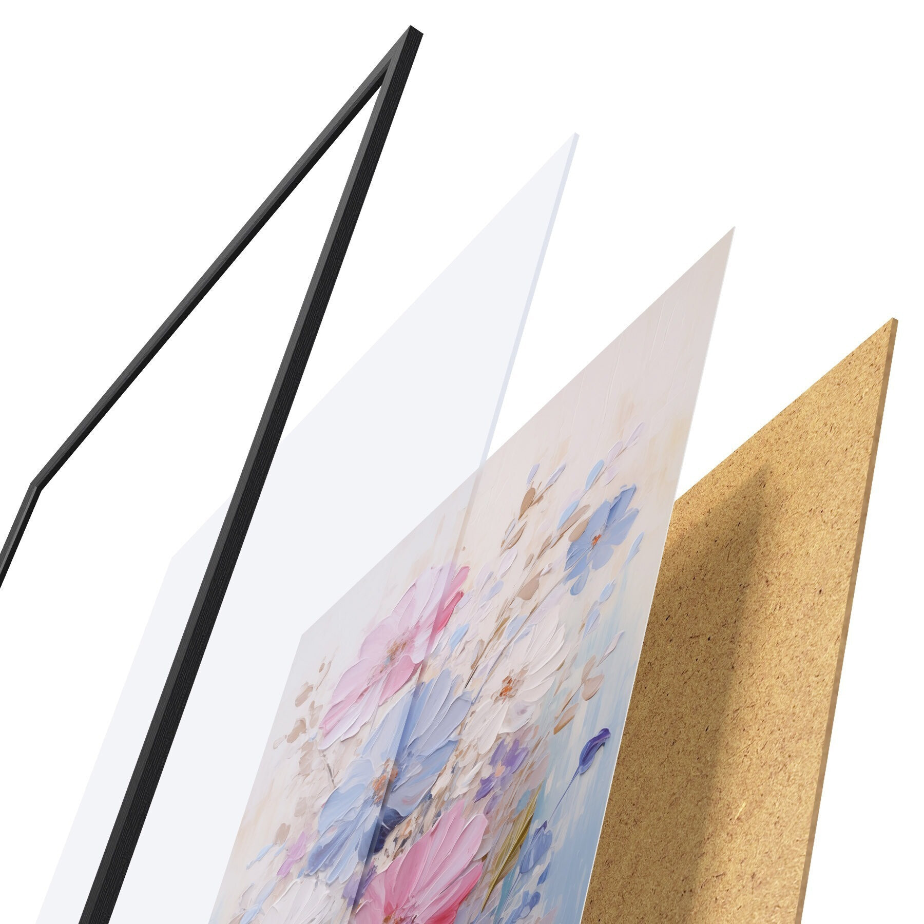 De poster bestaat uit een frame, plexiglas, geprinte afbeelding en spaanplaat achterkant. De poster kan meteen aan de muur worden gehangen dankzij de bevestigingen op de achterkant.