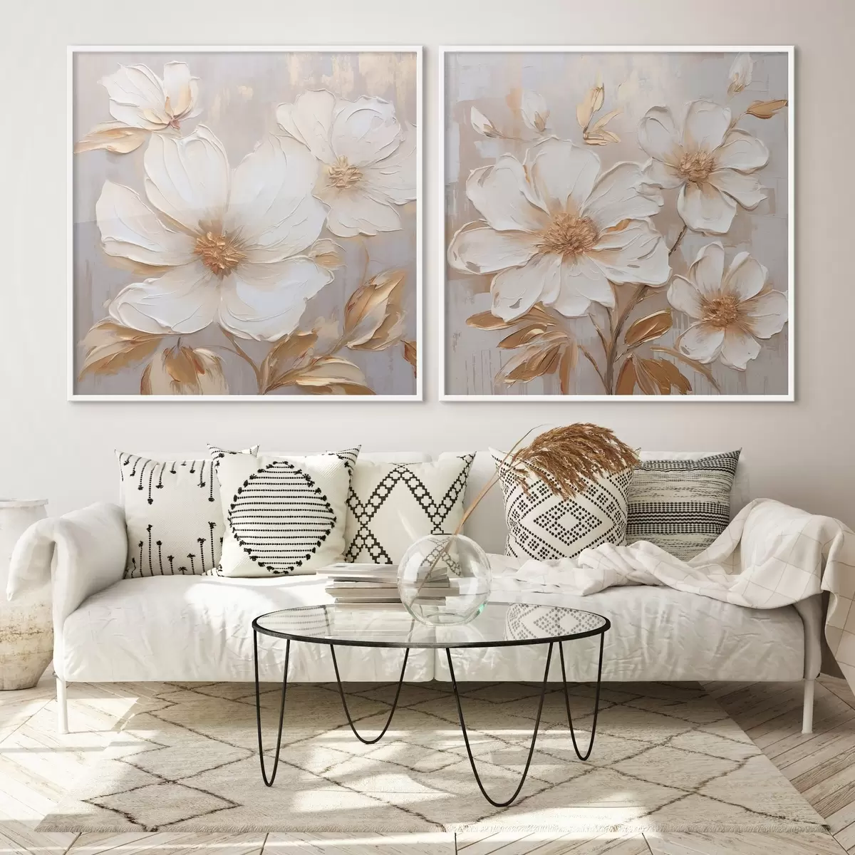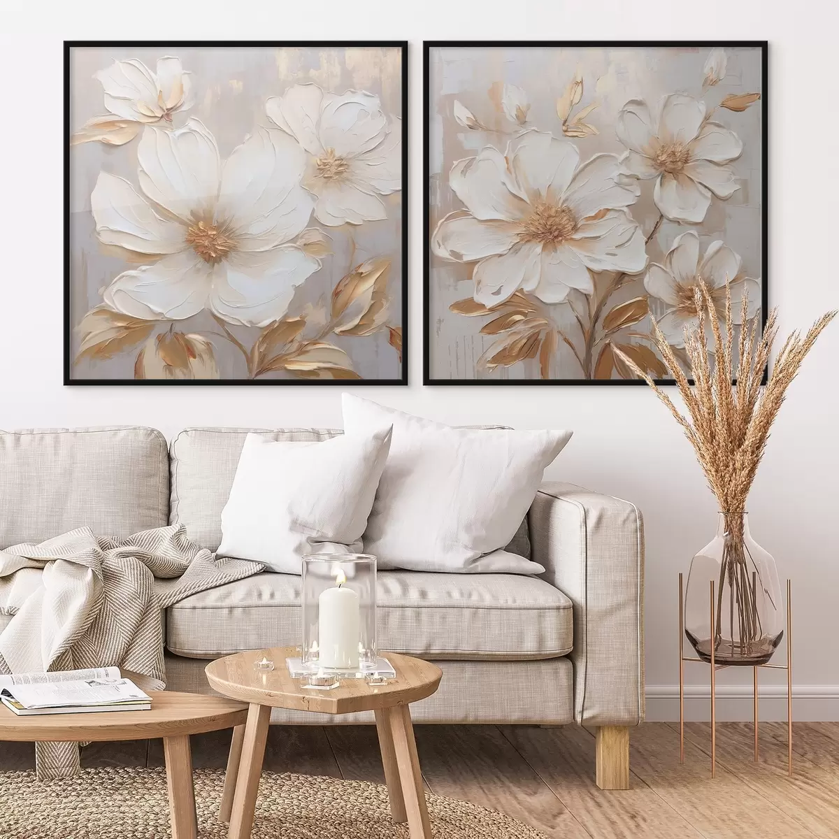 Poster Tweeluik met grote bloemen in lichte, warme kleuren N° d00927
