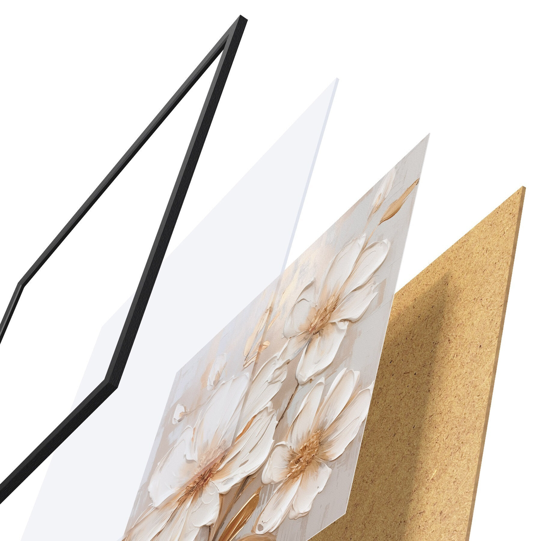 De poster bestaat uit een frame, plexiglas, geprinte afbeelding en spaanplaat achterkant. De poster kan meteen aan de muur worden gehangen dankzij de bevestigingen op de achterkant.