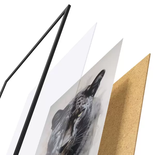 De poster bestaat uit een frame, plexiglas, geprinte afbeelding en spaanplaat achterkant. De poster kan meteen aan de muur worden gehangen dankzij de bevestigingen op de achterkant.