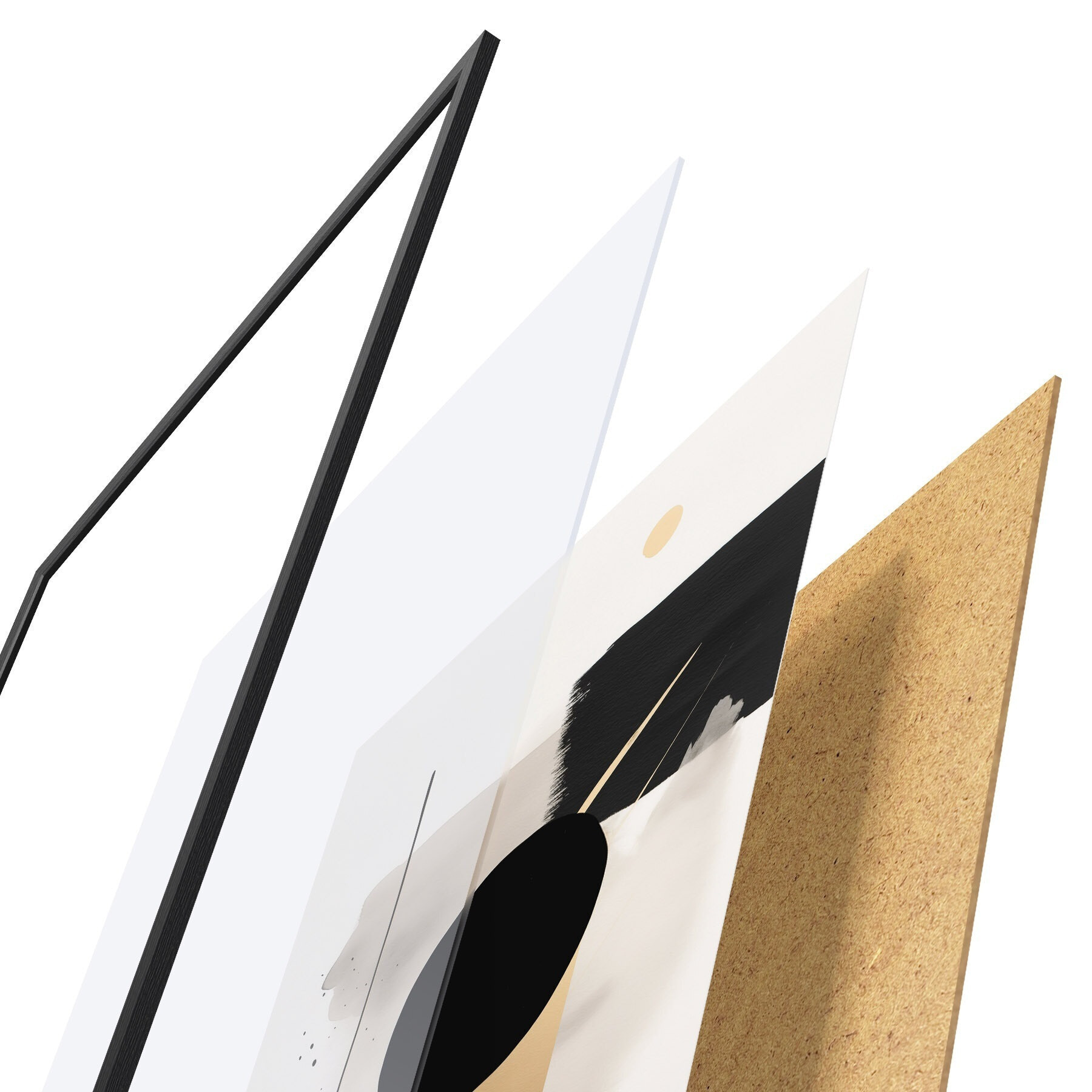 De poster bestaat uit een frame, plexiglas, geprinte afbeelding en spaanplaat achterkant. De poster kan meteen aan de muur worden gehangen dankzij de bevestigingen op de achterkant.