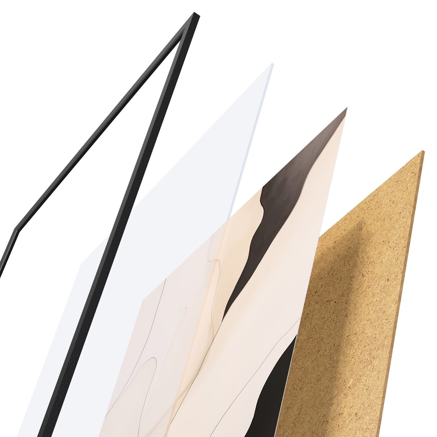 De poster bestaat uit een frame, plexiglas, geprinte afbeelding en spaanplaat achterkant. De poster kan meteen aan de muur worden gehangen dankzij de bevestigingen op de achterkant.
