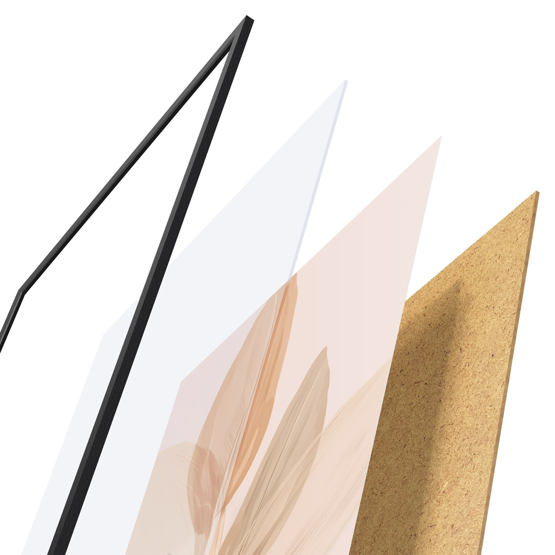 De poster bestaat uit een frame, plexiglas, geprinte afbeelding en spaanplaat achterkant. De poster kan meteen aan de muur worden gehangen dankzij de bevestigingen op de achterkant.