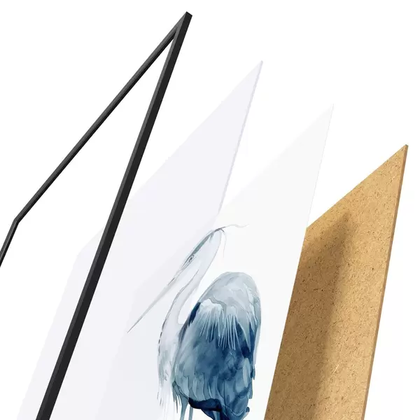 De poster bestaat uit een frame, plexiglas, geprinte afbeelding en spaanplaat achterkant. De poster kan meteen aan de muur worden gehangen dankzij de bevestigingen op de achterkant.