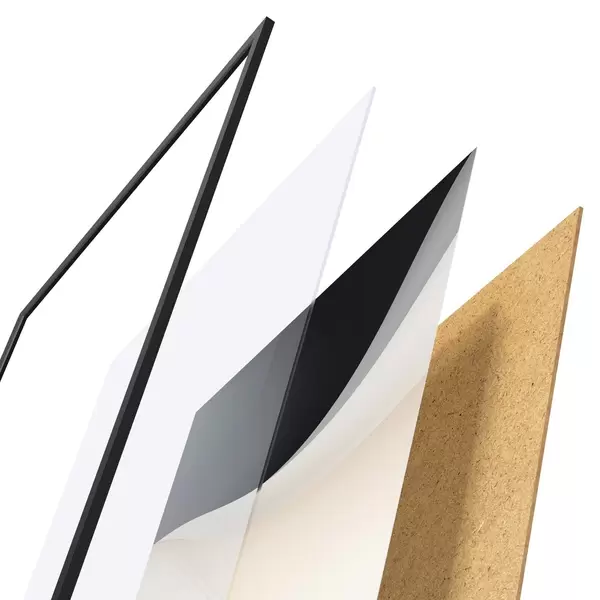 De poster bestaat uit een frame, plexiglas, geprinte afbeelding en spaanplaat achterkant. De poster kan meteen aan de muur worden gehangen dankzij de bevestigingen op de achterkant.