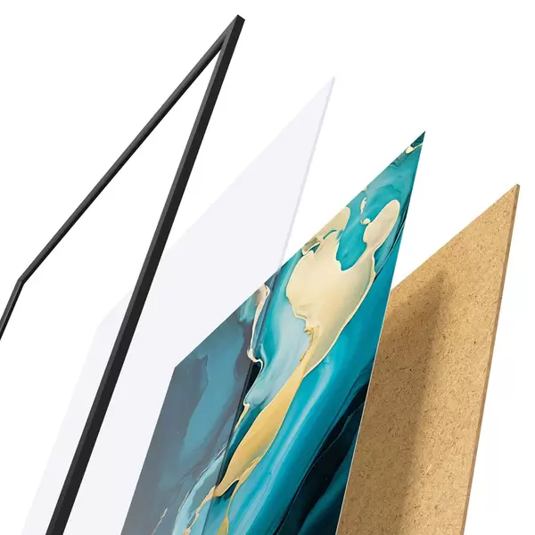 De poster bestaat uit een frame, plexiglas, geprinte afbeelding en spaanplaat achterkant. De poster kan meteen aan de muur worden gehangen dankzij de bevestigingen op de achterkant.