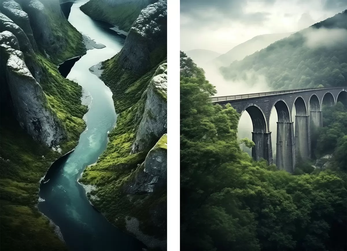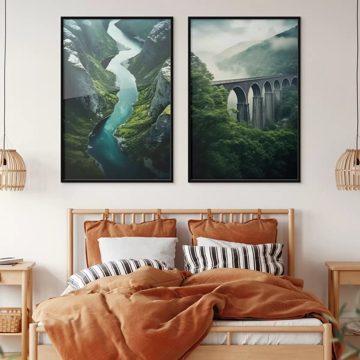 Poster Luchtfoto van een rivierkloof en een mistig viaduct in groene heuvels N° d00967