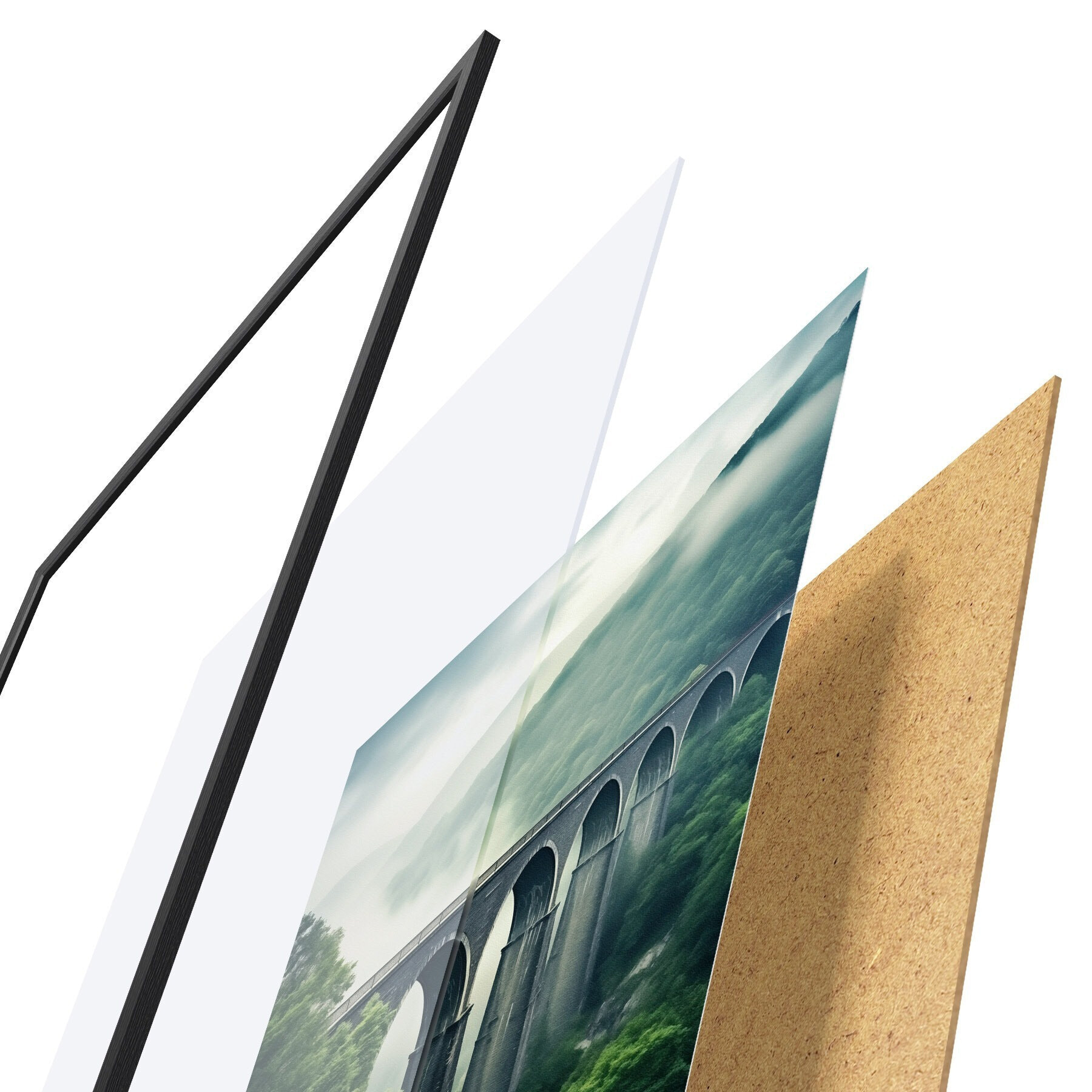 De poster bestaat uit een frame, plexiglas, geprinte afbeelding en spaanplaat achterkant. De poster kan meteen aan de muur worden gehangen dankzij de bevestigingen op de achterkant.