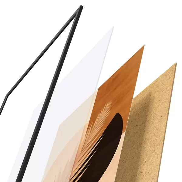 De poster bestaat uit een frame, plexiglas, geprinte afbeelding en spaanplaat achterkant. De poster kan meteen aan de muur worden gehangen dankzij de bevestigingen op de achterkant.