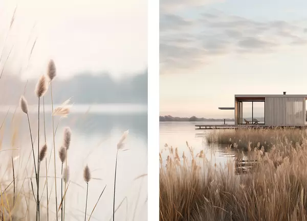 Poster Zachte rietkragen aan een rustig meer en een moderne hut aan de oever N° d00970