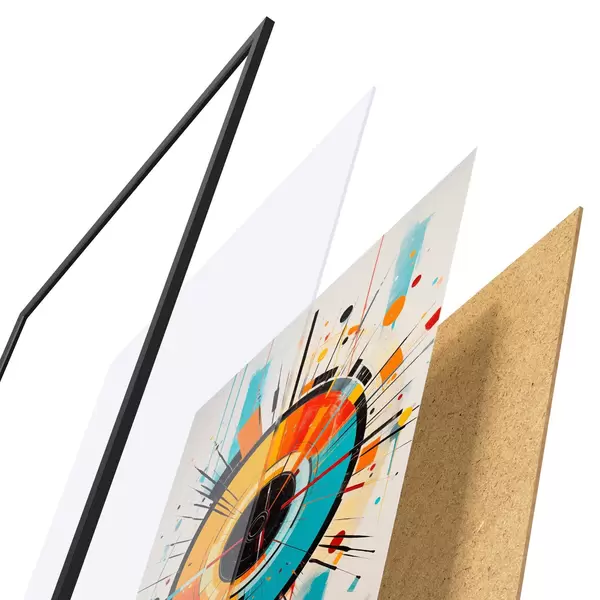 De poster bestaat uit een frame, plexiglas, geprinte afbeelding en spaanplaat achterkant. De poster kan meteen aan de muur worden gehangen dankzij de bevestigingen op de achterkant.