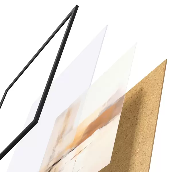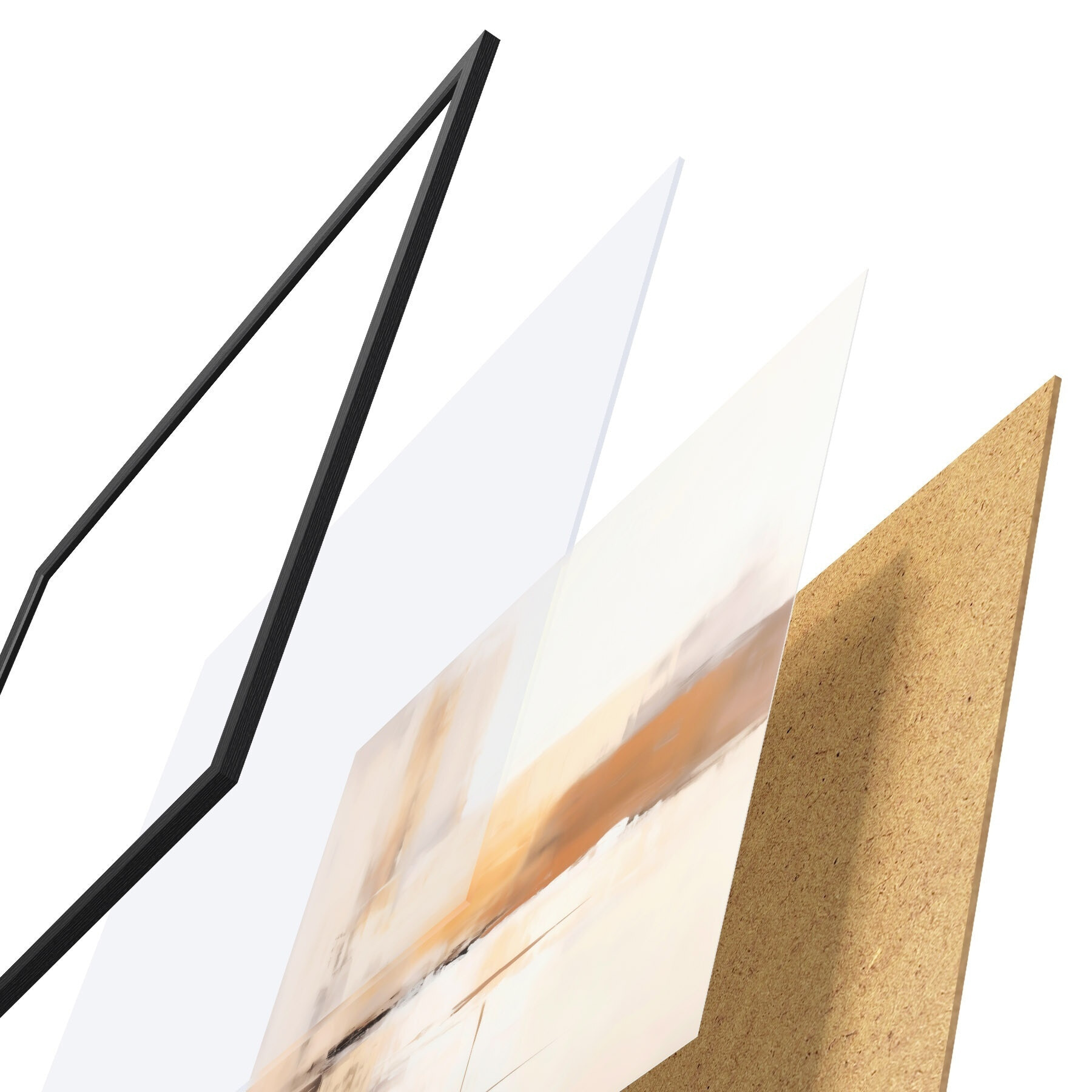 De poster bestaat uit een frame, plexiglas, geprinte afbeelding en spaanplaat achterkant. De poster kan meteen aan de muur worden gehangen dankzij de bevestigingen op de achterkant.
