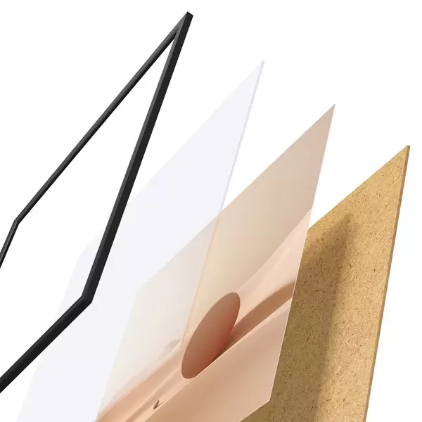 De poster bestaat uit een frame, plexiglas, geprinte afbeelding en spaanplaat achterkant. De poster kan meteen aan de muur worden gehangen dankzij de bevestigingen op de achterkant.