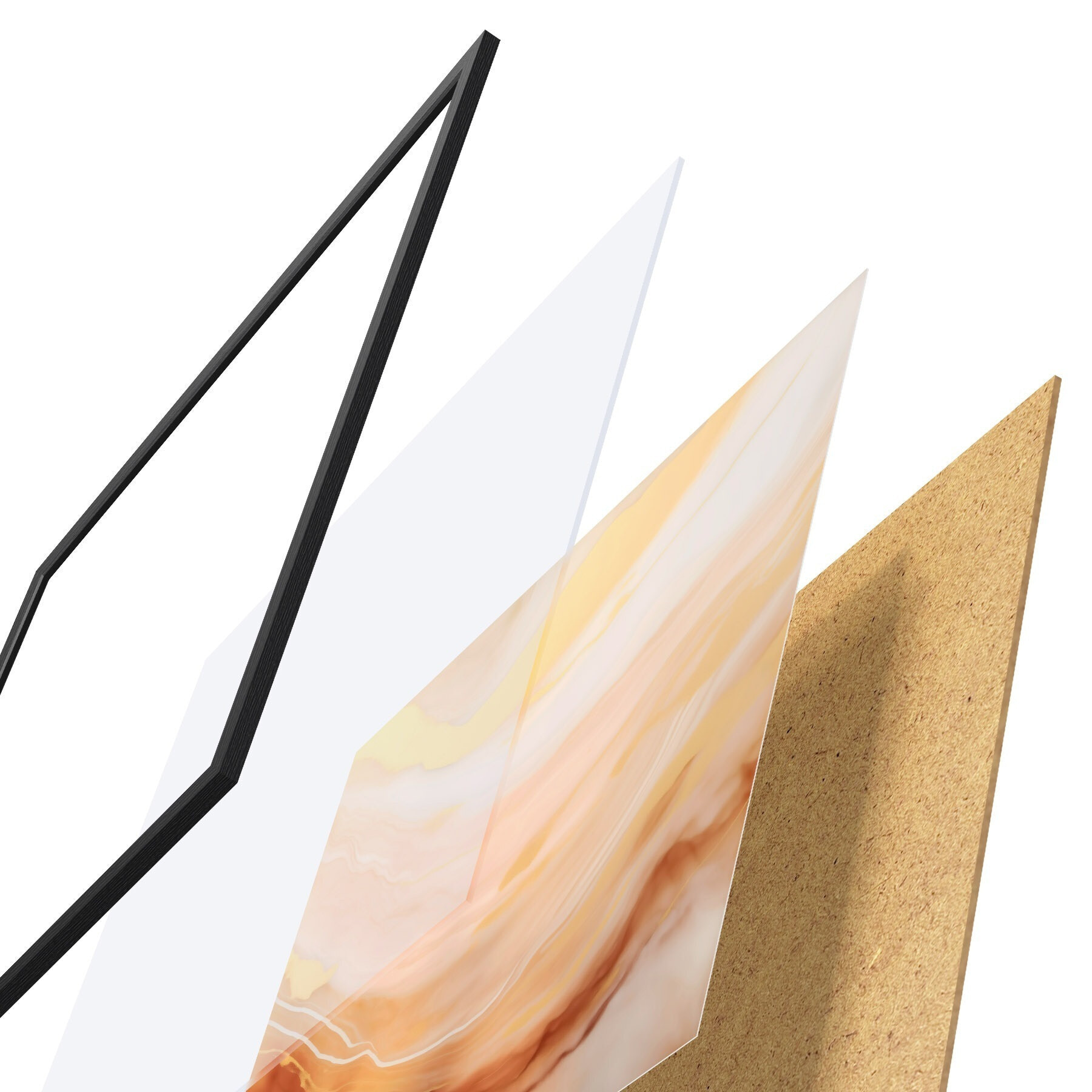 De poster bestaat uit een frame, plexiglas, geprinte afbeelding en spaanplaat achterkant. De poster kan meteen aan de muur worden gehangen dankzij de bevestigingen op de achterkant.