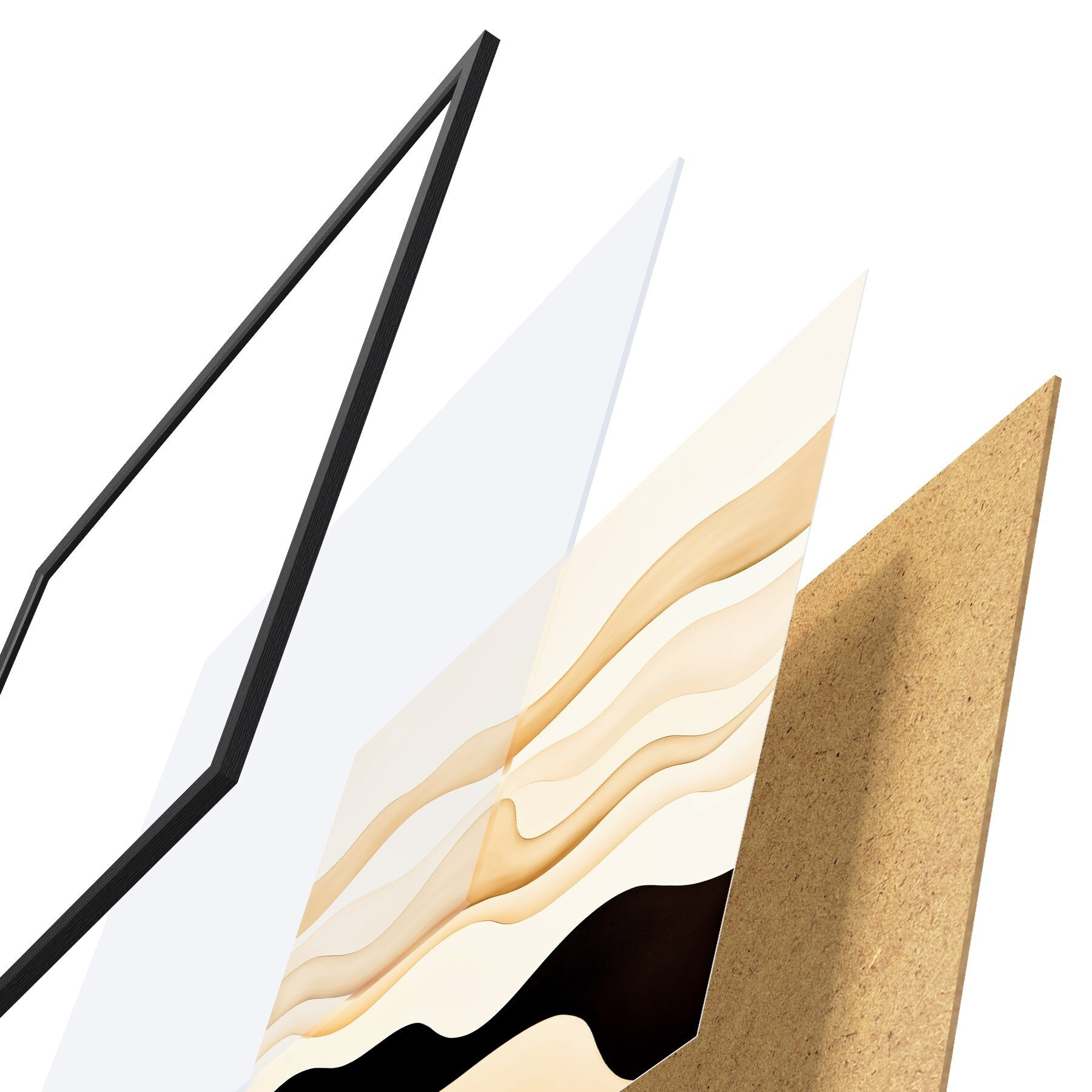 De poster bestaat uit een frame, plexiglas, geprinte afbeelding en spaanplaat achterkant. De poster kan meteen aan de muur worden gehangen dankzij de bevestigingen op de achterkant.