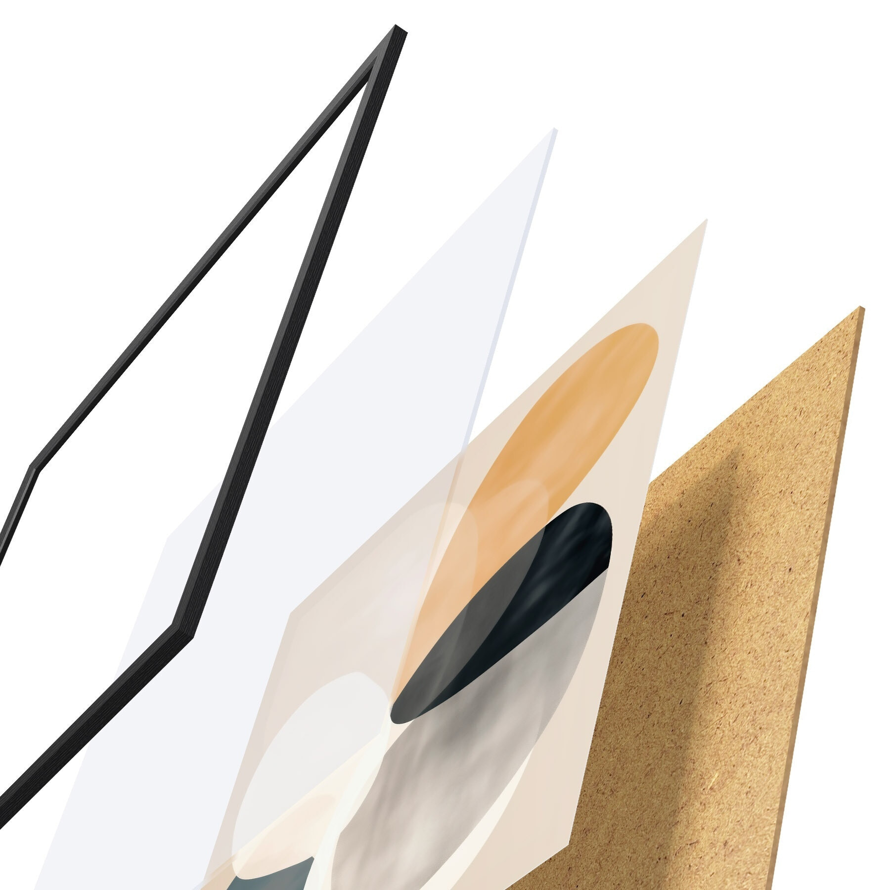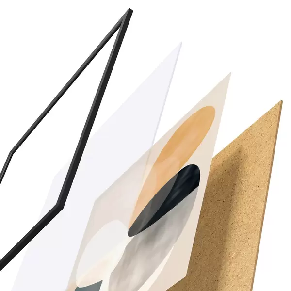 De poster bestaat uit een frame, plexiglas, geprinte afbeelding en spaanplaat achterkant. De poster kan meteen aan de muur worden gehangen dankzij de bevestigingen op de achterkant.