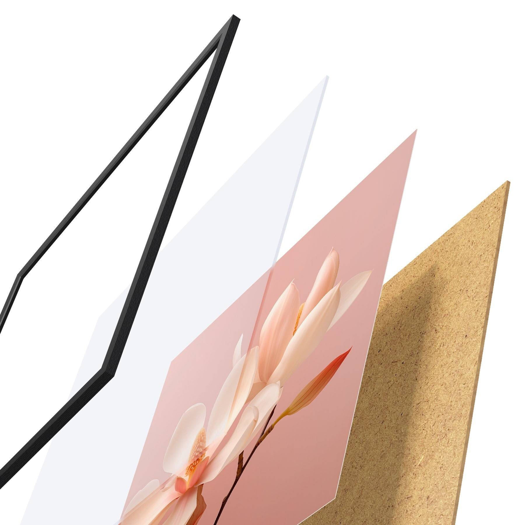 De poster bestaat uit een frame, plexiglas, geprinte afbeelding en spaanplaat achterkant. De poster kan meteen aan de muur worden gehangen dankzij de bevestigingen op de achterkant.