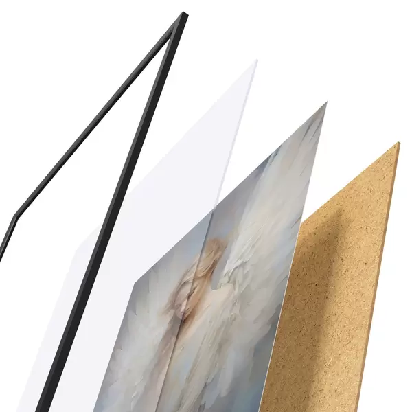 De poster bestaat uit een frame, plexiglas, geprinte afbeelding en spaanplaat achterkant. De poster kan meteen aan de muur worden gehangen dankzij de bevestigingen op de achterkant.