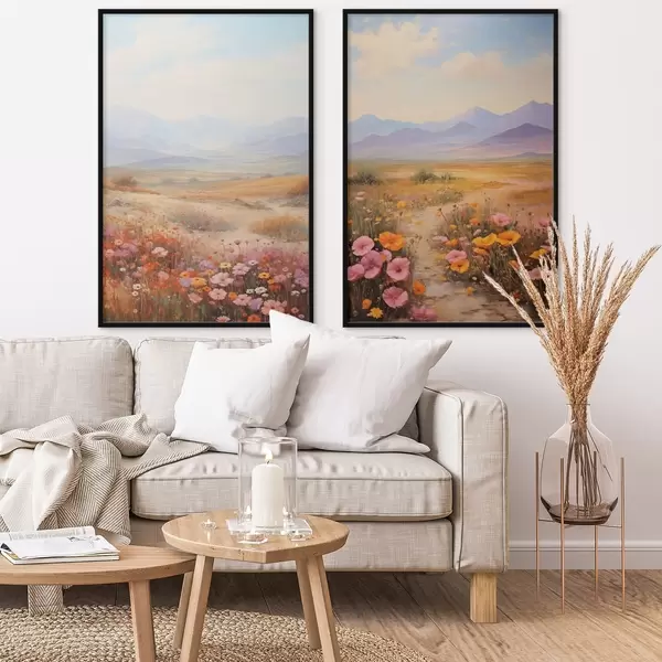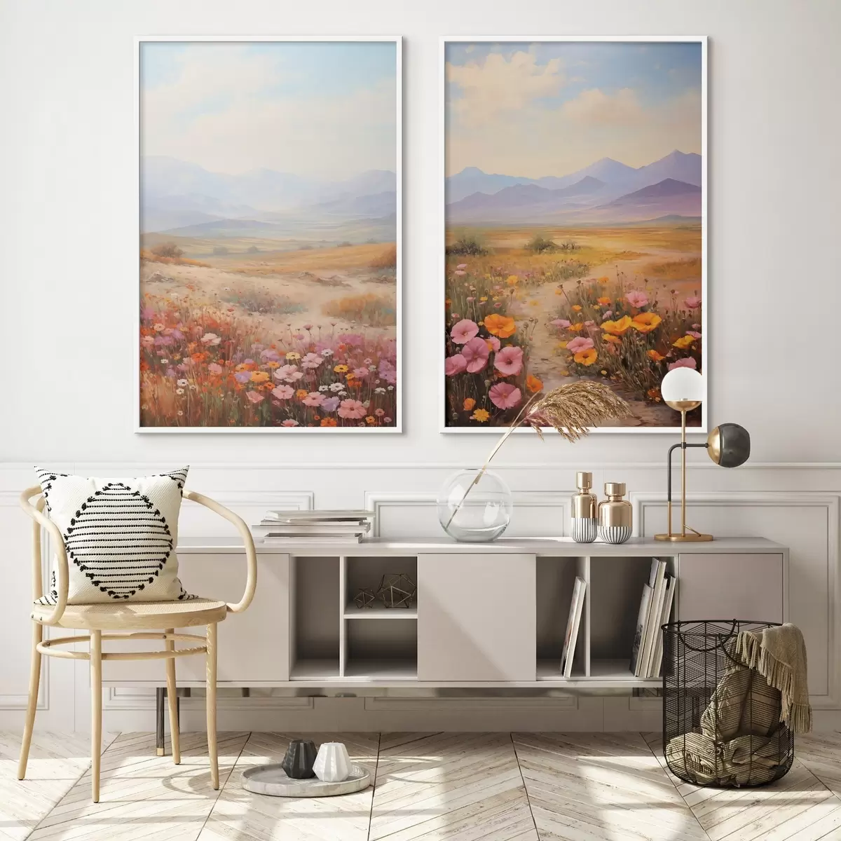 Poster Landschap, een veld met kleurrijke bloemen en bergen op de achtergrond, zachte pastelkleuren N° d01003