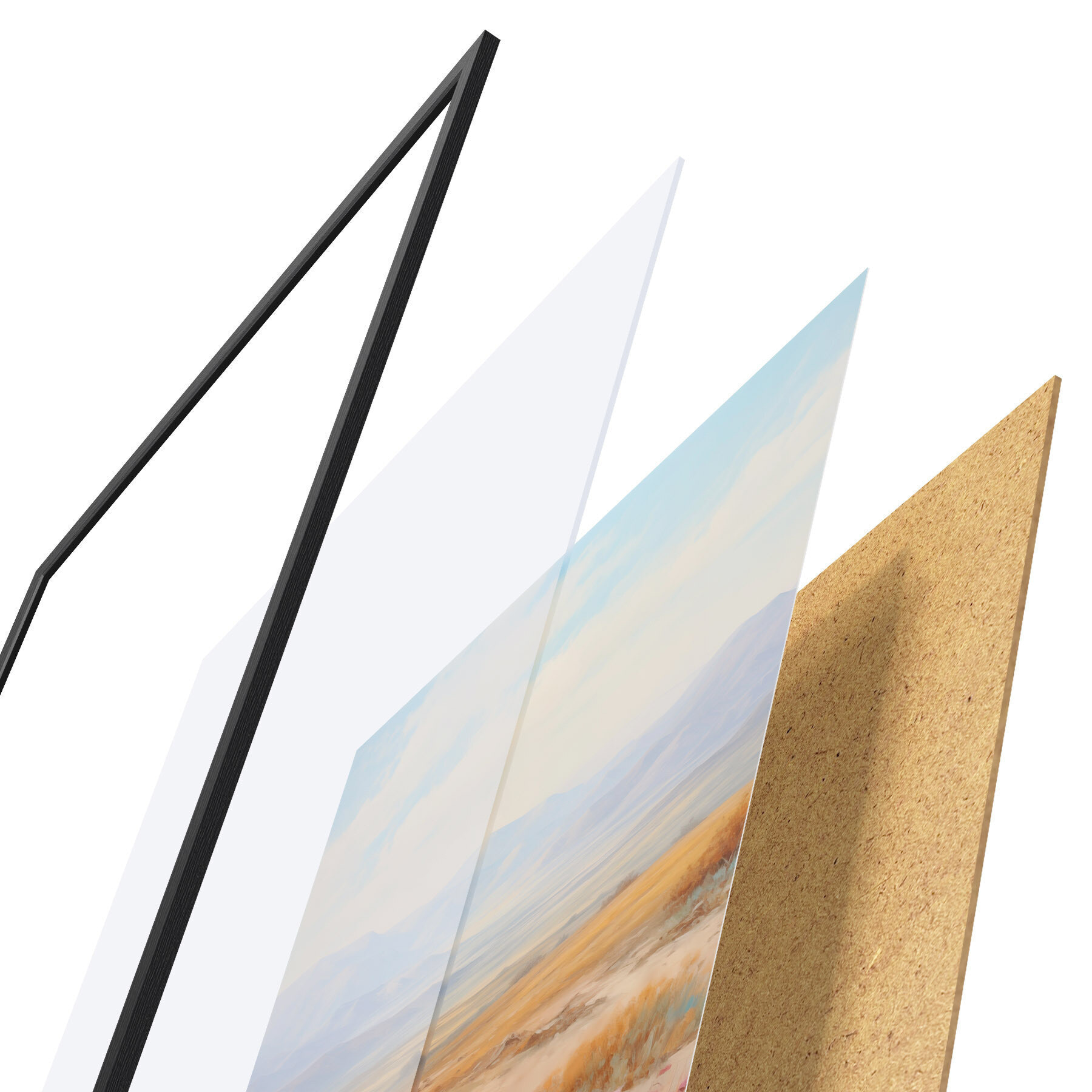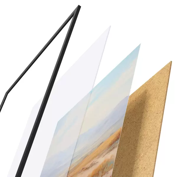 De poster bestaat uit een frame, plexiglas, geprinte afbeelding en spaanplaat achterkant. De poster kan meteen aan de muur worden gehangen dankzij de bevestigingen op de achterkant.