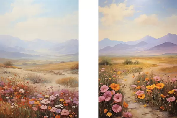 Poster Landschap, een veld met kleurrijke bloemen en bergen op de achtergrond, zachte pastelkleuren N° d01003