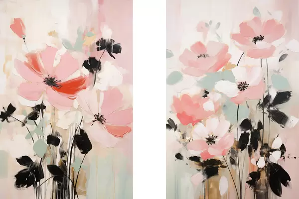 Poster Roze en zwarte bloemen met bladeren, zachte pastelkleuren, abstract bloemstuk, minimalistische kunst d01004
