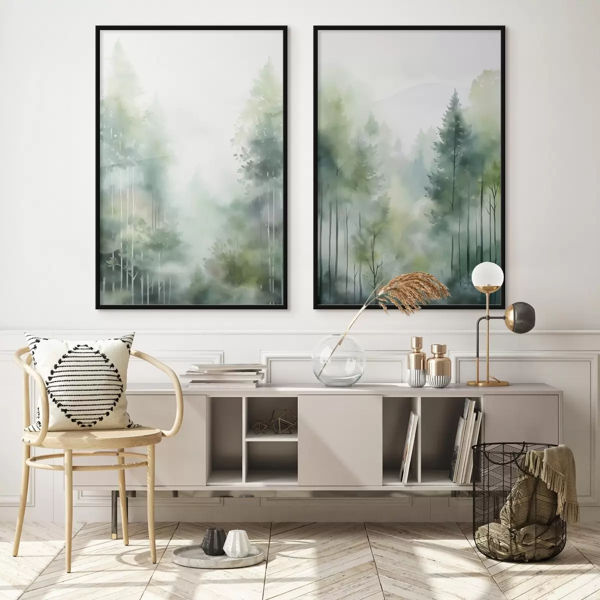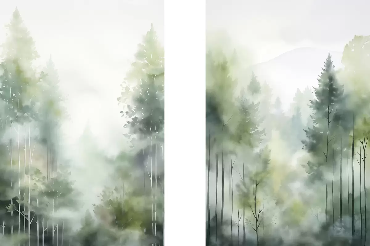 Poster Aquarelschilderij imitatie van abstract bos met hoge bomen en groen gebladerte, zachte gedempte kleuren N° d01005