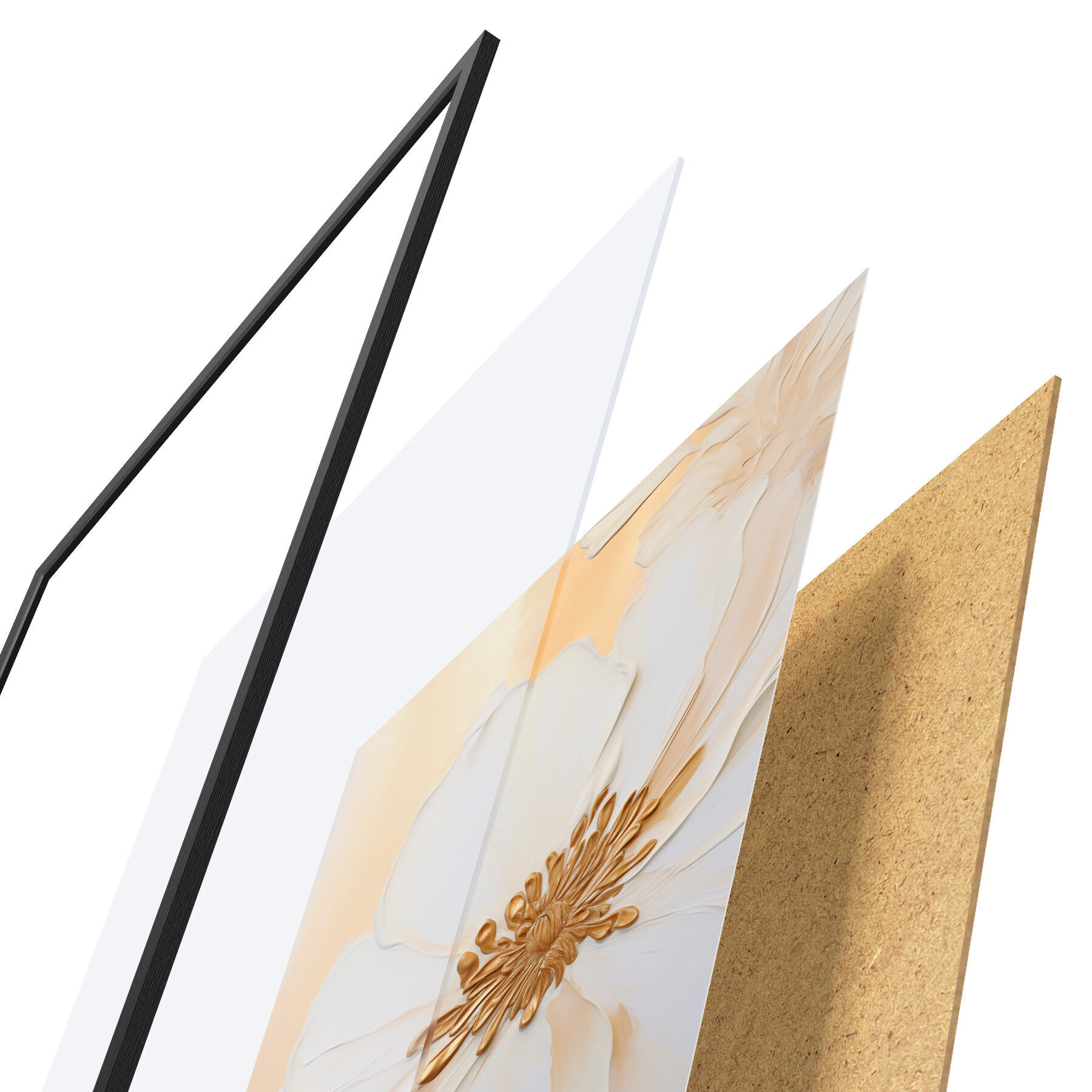 De poster bestaat uit een frame, plexiglas, geprinte afbeelding en spaanplaat achterkant. De poster kan meteen aan de muur worden gehangen dankzij de bevestigingen op de achterkant.