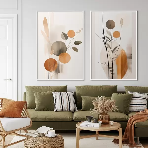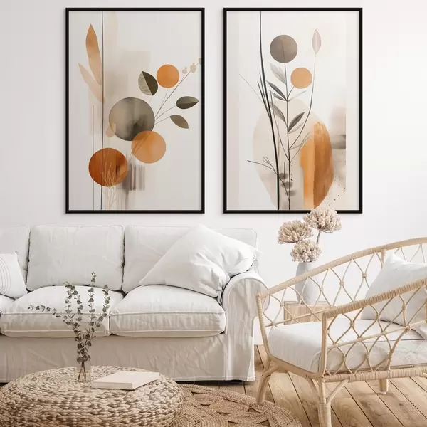 Poster Abstracte schilderijimitatie met oranje en grijze cirkels, bladeren en takken, moderne stijl, aquareleffect N° d01009