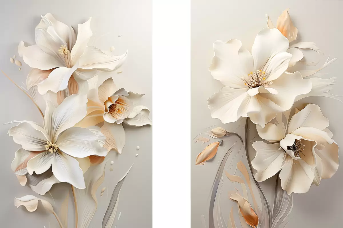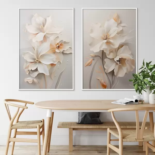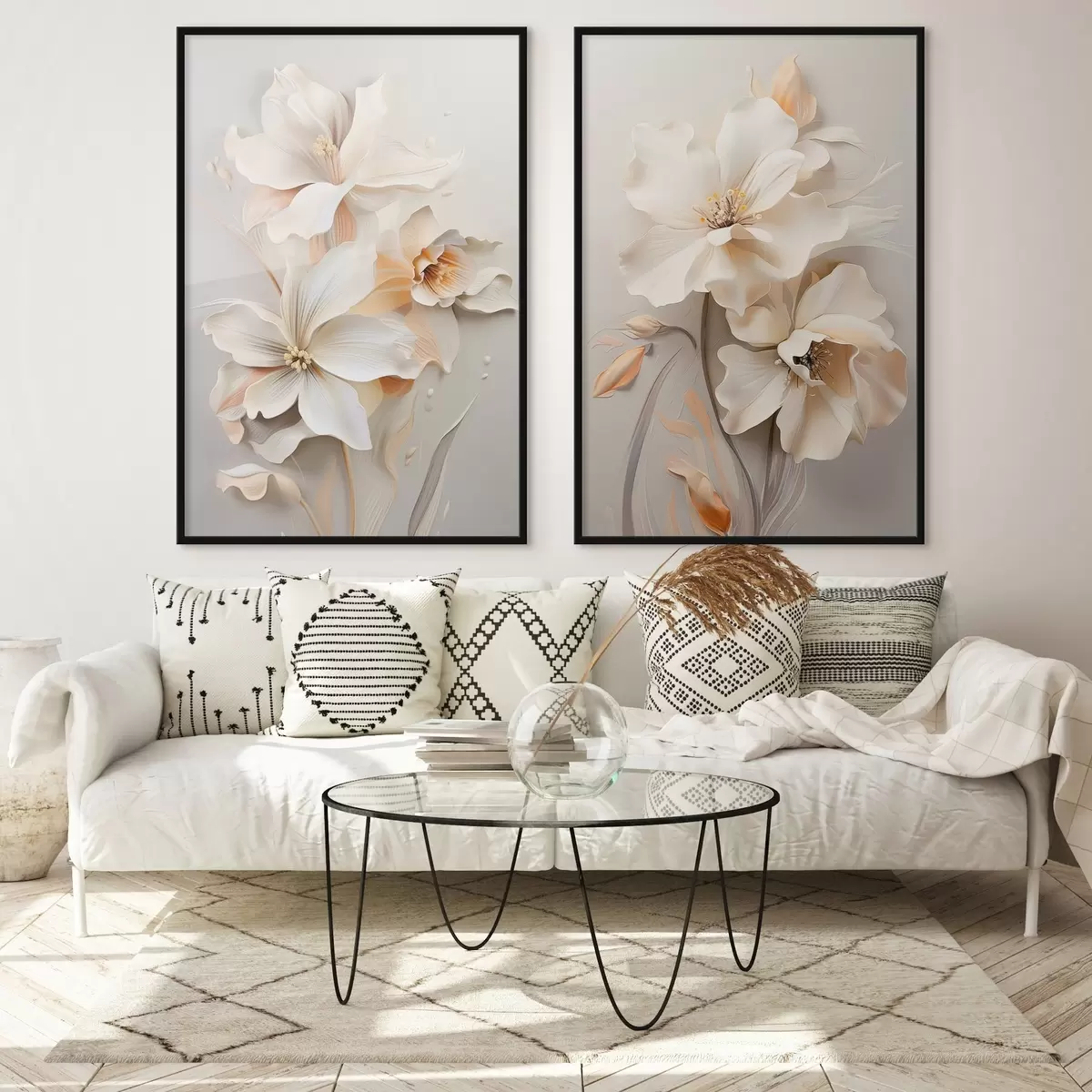 Poster Witte bloemen, bloemblaadjes met zachte schaduwen, lichtbeige achtergrond, elegante compositie, minimalistische stijl N° d01010