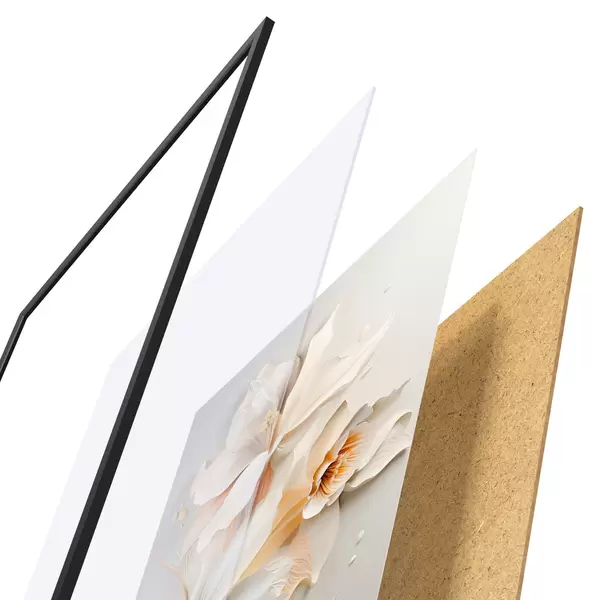 De poster bestaat uit een frame, plexiglas, geprinte afbeelding en spaanplaat achterkant. De poster kan meteen aan de muur worden gehangen dankzij de bevestigingen op de achterkant.
