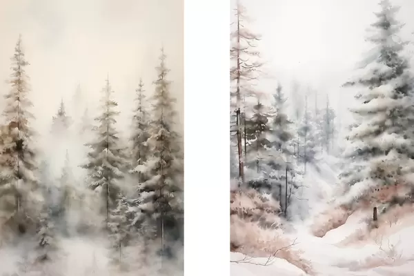 Poster Hoge dennenbomen bedekt met sneeuw, staande in een mistig bos, een zacht, gedempt winters tafereel N° d01011
