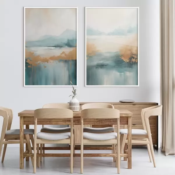 Poster Abstract landschap met bergen en meer in blauwgroen en gestructureerd geel, zachte penseelstreken, minimalistisch kunstwerk N° d01012
