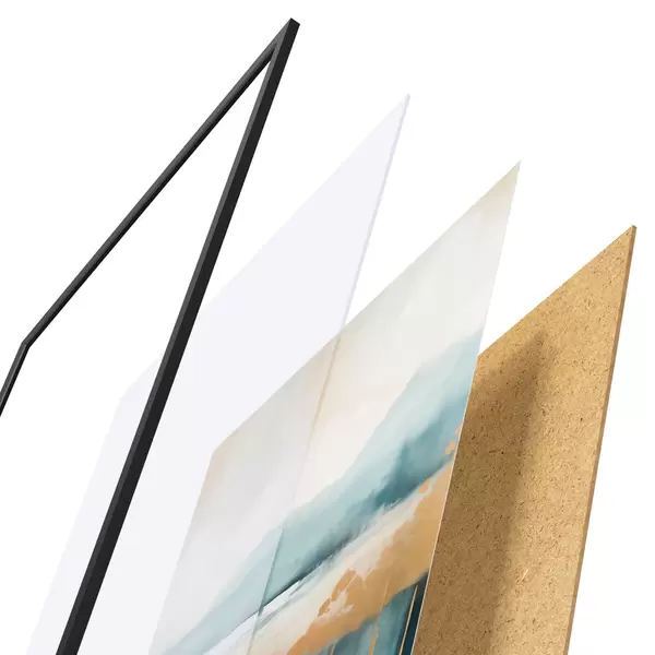 De poster bestaat uit een frame, plexiglas, geprinte afbeelding en spaanplaat achterkant. De poster kan meteen aan de muur worden gehangen dankzij de bevestigingen op de achterkant.