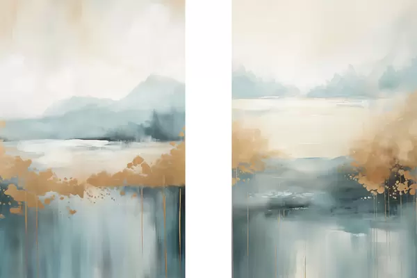 Poster Abstract landschap met bergen en meer in blauwgroen en gestructureerd geel, zachte penseelstreken, minimalistisch kunstwerk d01012