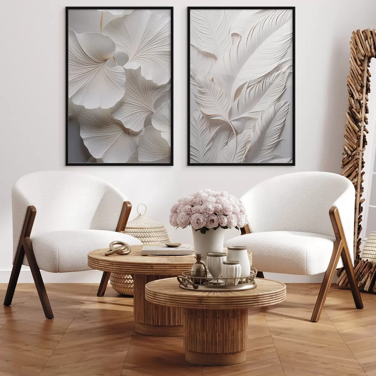 Poster Witte ginkgobladeren en lange bladeren met ingewikkelde details, waardoor een gestructureerd en gelaagd effect ontstaat, minimalistische kunst N° d01013