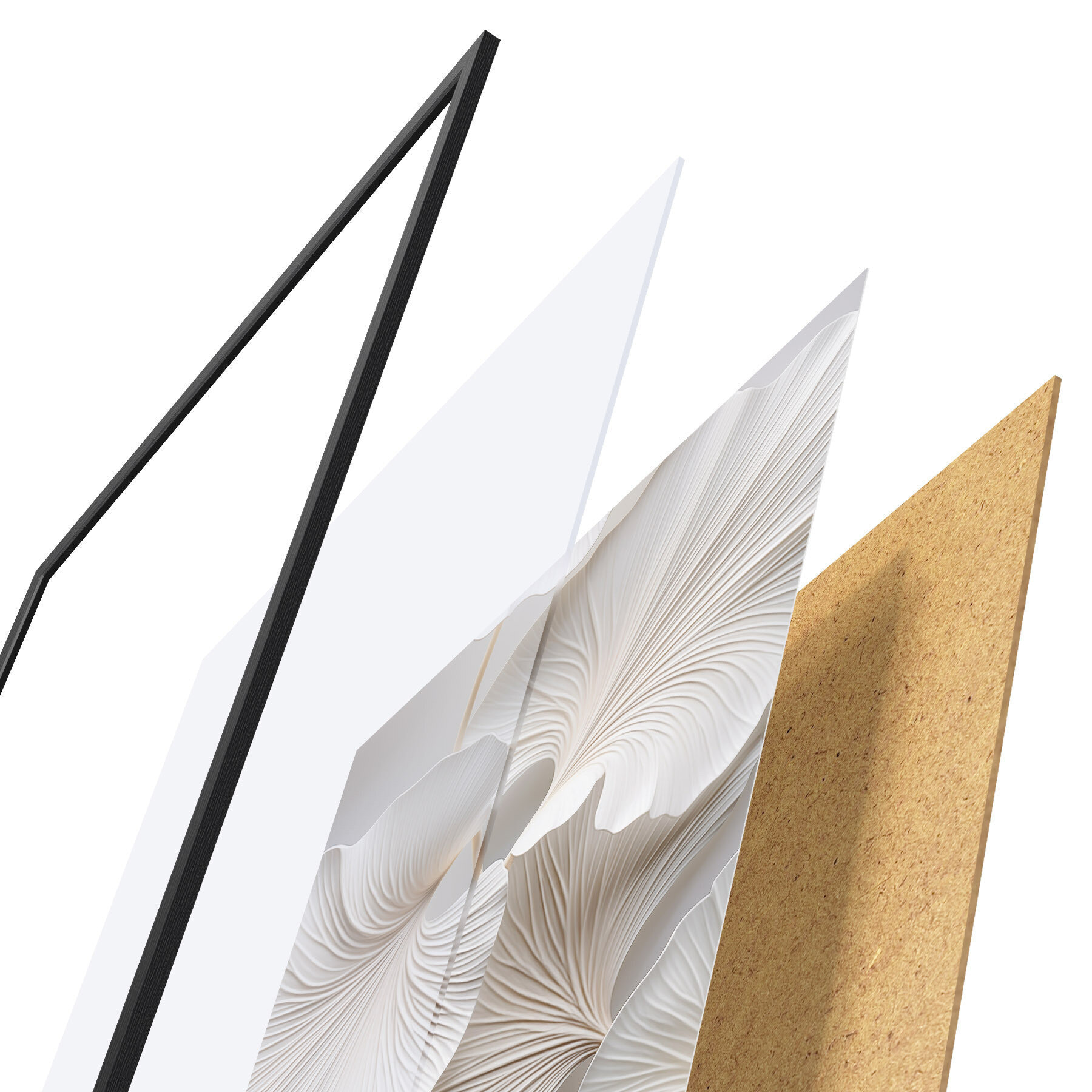 De poster bestaat uit een frame, plexiglas, geprinte afbeelding en spaanplaat achterkant. De poster kan meteen aan de muur worden gehangen dankzij de bevestigingen op de achterkant.