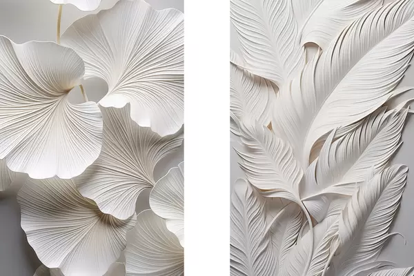 Poster Witte ginkgobladeren en lange bladeren met ingewikkelde details, waardoor een gestructureerd en gelaagd effect ontstaat, minimalistische kunst d01013