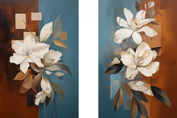 Poster Abstracte witte bloemen en bladeren tegen een achtergrond van bruin en blauw met abstracte vormen, in een minimalistische stijl N° d01015